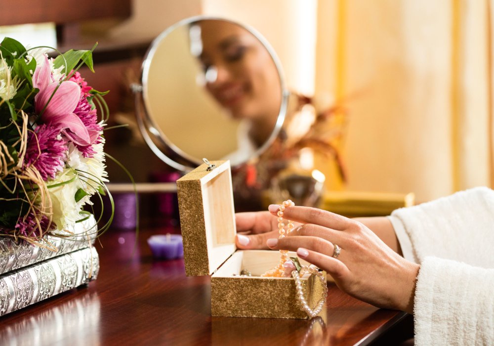 Um die Schönheit Ihres indischen Schmucks zu bewahren, vermeiden Sie den Kontakt mit Wasser, Parfüm und Chemikalien. Bewahren Sie ihn nach dem Tragen in einem luftdichten Behälter auf und reinigen Sie ihn vorsichtig mit einem weichen, trockenen Tuch. Achten Sie darauf, den Schmuck nicht übermäßiger Hitze und Feuchtigkeit auszusetzen, um seine Eleganz lange zu erhalten.